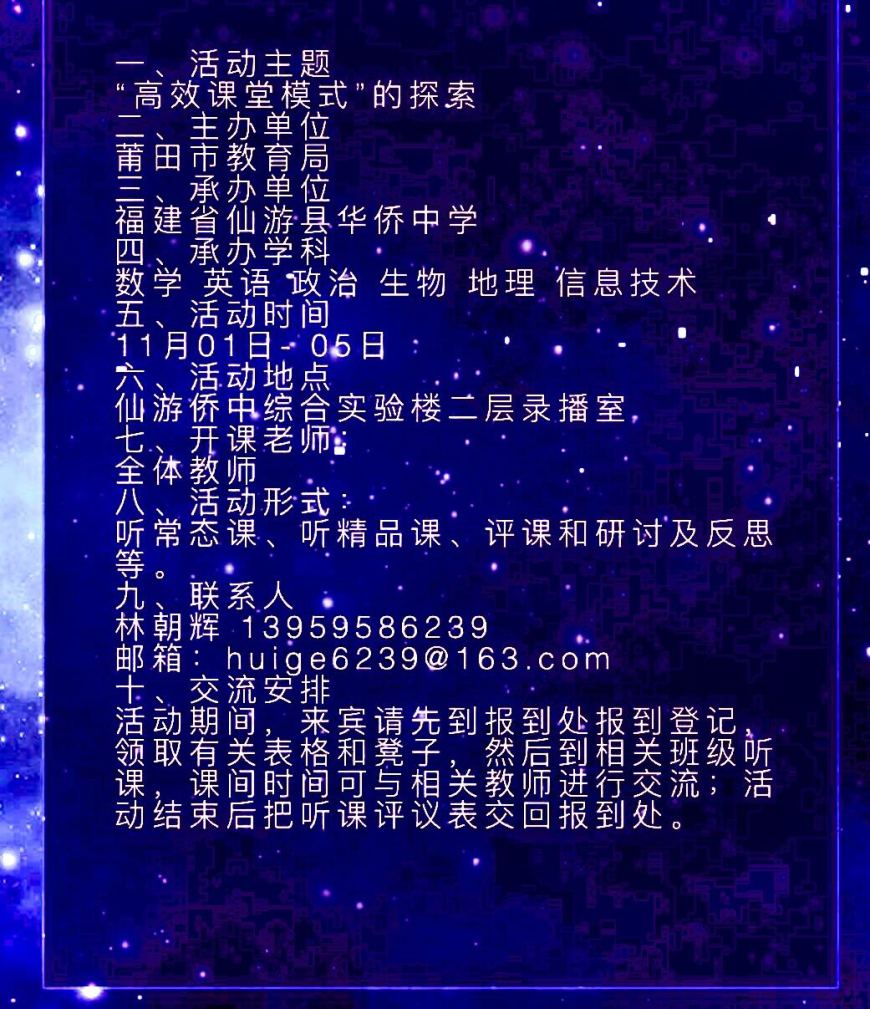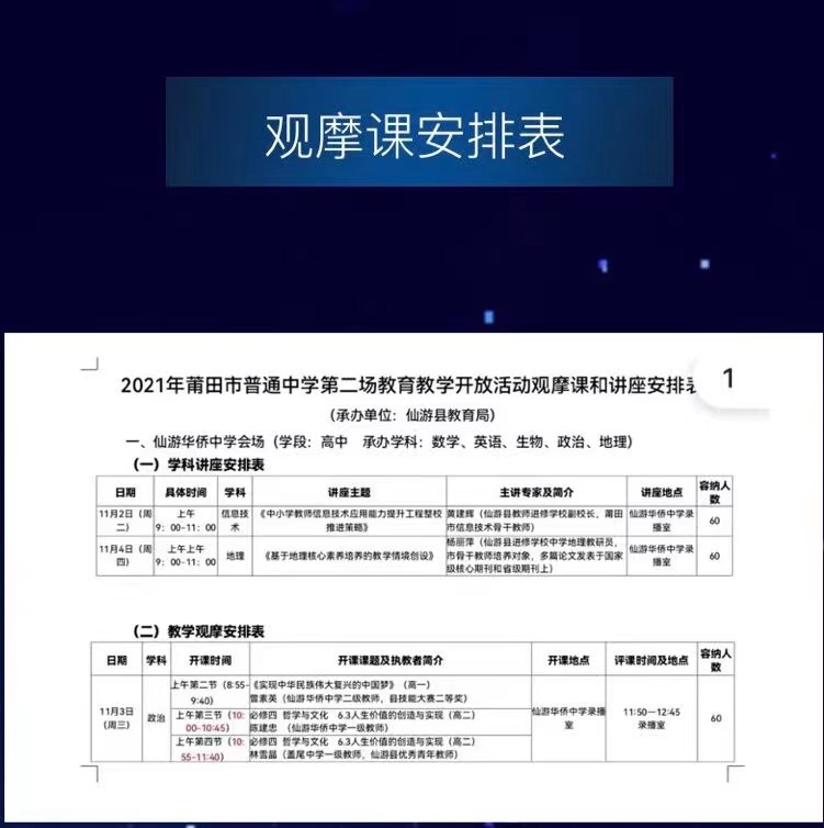 仙游县华侨中学秉持“以德立校 以爱育人”的办学宗旨,素以课程育人,以爱育人,以文化人,以德树人,求实创新,追求卓越。各学科教师通过精心设计,仔细打磨,力求每一节高品质的课堂教学,都能以工匠精神,展现出丰富多无的“化育”功能。本着“开放、共享、合作、共赢”的原则,根据上级工作布置,决定于2021年11月1--5日在仙游县华侨中学举行2021年市级教育教学公开周活动,诚挚邀请各位同仁前来切磋交流!