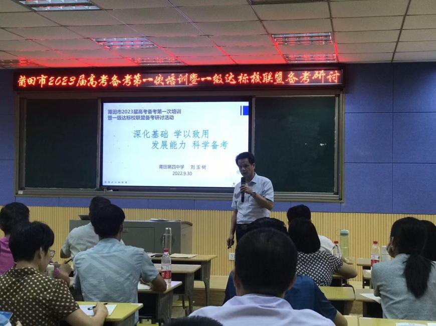 本次备考研讨活动由莆田市教师进修学院物理教研员林庆新老师主持,活动分成三个议程:一、教师授课;二、专家讲座;三、一级达标校联盟研讨。