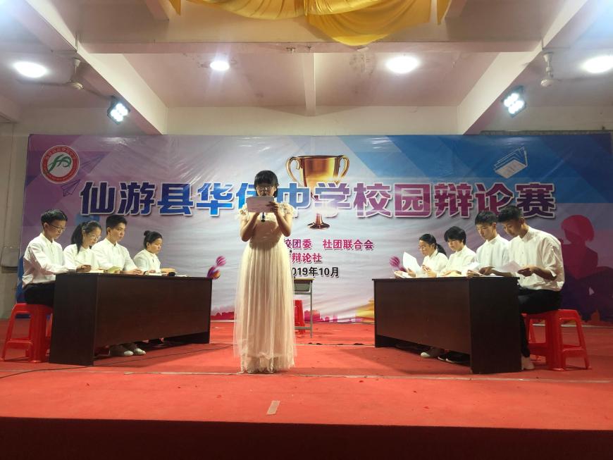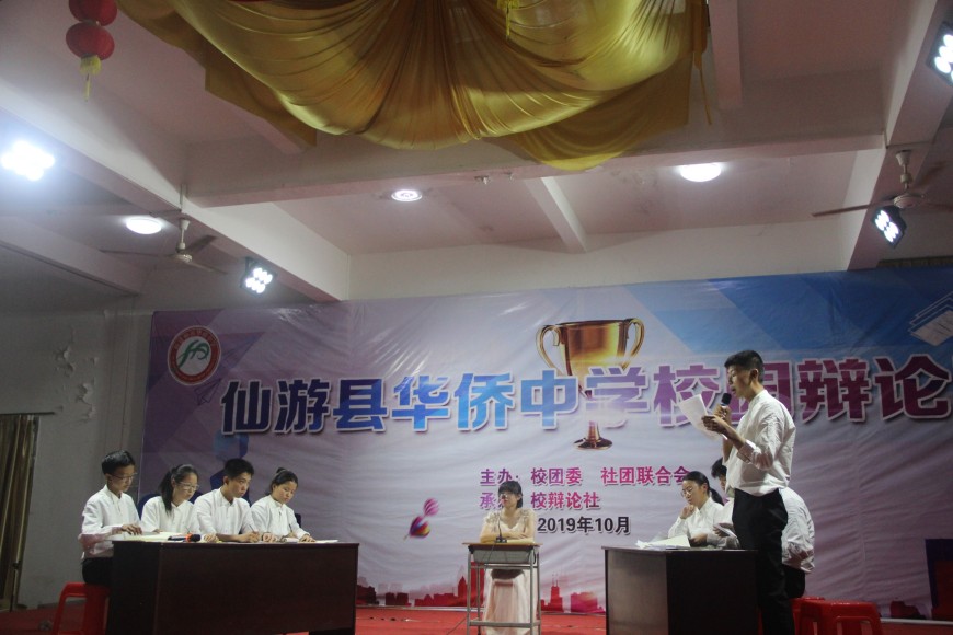 2019-10-25仙游县华侨中学 ![]() 为了丰富我校学生的深厚文化生活,开阔学生的视野,锻炼学生的思维能力,培养学生团队团结协作能力,引导学生关注社会、关注时事、关注生活,促进学生综合素质的提高,展现新时代侨中人独特的青春风采,加强良好校风学风建设和校园文化建设起到积极推动作用,10月24日下午,由校团委组织的校园辩论赛决赛在学生社团活动中心隆重举行!