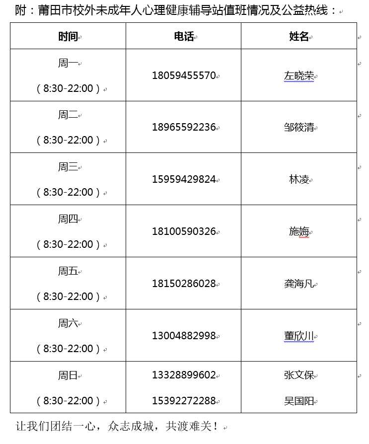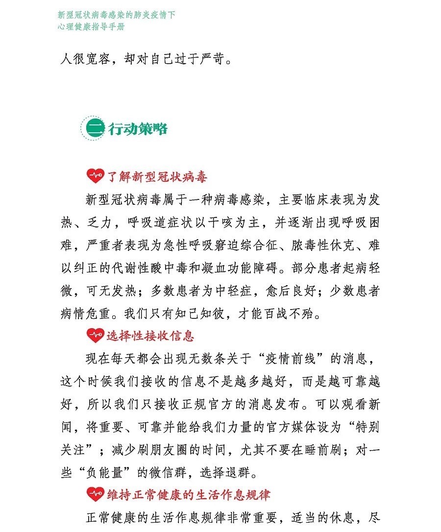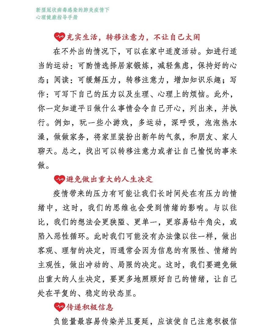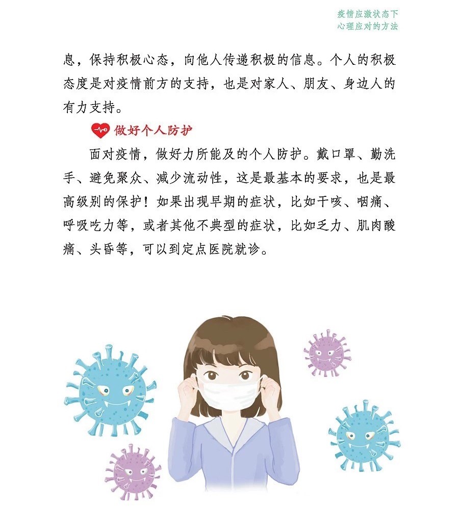 2020-02-02仙游县华侨中学 仙游县华侨中学应对新型冠状病毒师生居家心理防护自助指南 ![]() 亲爱的家长、老师、同学们: 新年好!给大家拜个晚年! 当前,面对突如其来的新型冠状病毒感染的肺炎疫情冲击,每个人不可避免的产生担忧、害怕、焦虑、恐慌等应激反应。来势汹汹的新型冠状病毒肺炎疫情,不仅是对我们生理卫生防疫能力的一种考验,同样也是对我们每一个人心理健康的挑战。为了科学有效地做好疫情防控期间师生在家的心理关护,校心理健康教育中心特提供以下心理防护自助指导手册,希望帮助老师和同学们在家进行心理支持与防护。 一、面对疫情,为什么需要重视心理防护? 良好的心态可以改善人的气血循环,而焦虑紧张、恐惧担忧的心态会让我们机体局部气血不畅,反而会使得疾病加重。无论得病与否,保持良好的心态都极其重要。 因此,我们既需要重视新型冠状病毒疫情的严峻性,在行为上严肃对待,做好自我防护,同时也要主动调适自己的心态,提升自己的免疫力,让阳光心态来为自己保驾护航。 二、疫情期间可能会产生的身心反应 面临正在肆虐的肺炎疫情,我们因害怕可能会出现以下一些心理反应: 1. 认知偏差 面对朋友圈、微信群、微博、短视频软件里围绕疫情纷繁复杂、真真假假的消息,变得过度关注负面信息,轻信谣言,担心疫情难以控制,物资短缺等等。 2.情绪失衡 (1)疑病恐惧:特别关注自己的身体,并将所有身体的不舒服与疫情联系起来,总是怀疑自己得病了。 (2)焦虑:对疫情以及自己的现状失去控制感而感到焦虑,具体表现为:担心肺炎发生在自己及家人身上;看到疫情相关信息感到发生在自己身上;对疫情爆发区的人和物过度警觉,并不愿接触等。 (3)抑郁:对未来悲观失望,情绪持续低落,无意义感增强。 (4)易怒、易激惹:在焦虑和恐慌中对错误的容忍度变低,对疫情处置及通报、疫区人员进行各种批评指责,甚至对身边人感到生气愤怒。 3.行为问题 (1)反复洗手,反复测量体温,反复去查看疫情相关信息,部分人可能出现强迫性思维,想象自己和家人患病。 (2)逃避、回避一些场景和信息。 4. 躯体不适 (1)食欲下降。 (2)头痛,胸痛,胸闷,手足无措,坐立不安。 (3)睡眠差,入睡困难、睡眠浅、早醒、多梦且多恶梦。 三、积极应用心理调节策略,保持稳定良好心态 我们在面对重大突发事件时,产生以上的反应是非常正常的现象,不必过度焦虑,但如果上述问题已经持续一段时间,且问题较为严重并影响到了你的生活,它也许在提示你,你需要关注自己的情绪状态并采取一些措施了,我们不妨可以试试这样调适自己: ![]() ![]() ![]() ![]() ![]() ![]() ![]() ![]() ![]() ![]() ![]() ![]() ![]() 四、停课不停学,学习不掉线 最最重要的是,停课不停学,停课不停教。我校研究制订了“停课不停学”的各个年段延迟开学工作安排表,通过爱学堂等学习平台和家长监督,家校积极配合,指导学生在家的学习和生活,真正实现停课不停学。老师们加入班级微信群,推送电子教材,布置学习任务,按照时间安排表,为学生在线答疑。 五、必要时寻求专业的心理支持与疏导 当然,每个人的状态和适合的应对方式各有不同,如果这些方式不太适合你,没关系,最后我们也列出我校心理健康辅导站咨询热线和我市校外未成年人心理健康辅导站在疫情期间专门开通的心理辅导公益热线和联系方式,希望能帮助你和家人平稳、健康地渡过这一次疫情带来的不一样的春节! 仙游侨中心理支持热线: 李老师:15260990022 郑老师:13799690605 郑老师:13599867399 曾老师:15880345762 线上咨询QQ:604182499 服务时间:每天8:00—22:00 服务对象:广大师生及家长 ![]() |