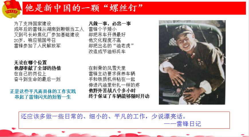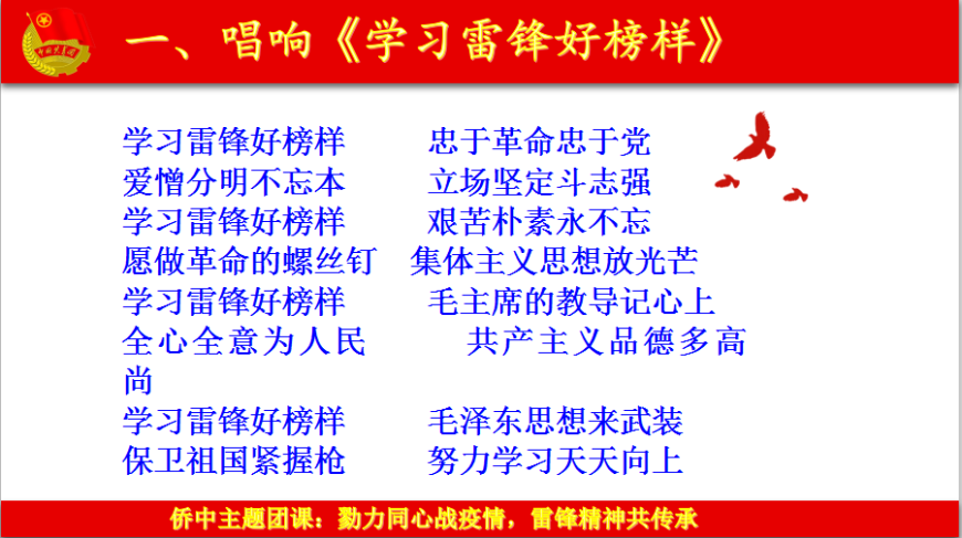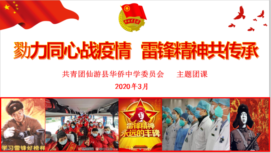 ![]() ![]() ![]() 仙游侨中的青年学子们, 今天, 让我们一起通过空中团课, 一起学习、感悟雷锋精神。 ![]() ![]() 本期团课的主题是 ![]() 勠力同心战疫情 雷锋精神共传承 ![]() ![]() ![]() ![]() 一、齐唱《学习雷锋好榜样》 ![]() 这首歌颂雷锋同志的歌一直唱到今天。 曲子简洁明快,铿锵有力,以其特有的旋律和激情,感染和激励着一代又一代人。今年是毛泽东同志“向雷锋同志学习”题词57周年7,侨中青年学子们,让我们用青春的热情,唱响《学习雷锋好榜样》。