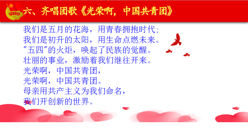 ![]() 六:齐唱团歌《光荣啊,中国共青团》 ![]()
