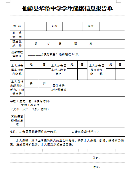 返校前 02 1.凡具有以下情形的学生暂缓入校: 第一,开学返校前14天从省外返回隔离观察不满14天的学生; 第二,过去14天有湖北旅居史或韩国、伊朗、日本、意大利等重点地区和国家旅居史的学生; 第三,过去14天与湖北、韩国、伊朗、日本、意大利等重点地区或国家等疫区人员密切接触过的学生; 第四,有发热(体温≥37.3℃)和干咳、气促、乏力、腹泻等症状的学生(请及时到就近的正规医院就医,待痊愈后方可返校)。 注:有以上任意情形者,请提前向班主任报告情况,暂缓返校,请按照当地医疗部门要求隔离观察需满14天,每天测量体温,并及时报告给班主任,连续14天后无异常症状方可向班主任申请并持相关证明返校。 2.继续做好自我防护,不到人群密集地方,不参加聚会,戴口罩,勤洗手。 欲返校的学生,必须于开学前14天在莆田市内居家隔离观察连续14天以上,无咳嗽、咳痰、咽痛、头痛、鼻塞、流涕、乏力、肌肉酸痛、呼吸困难等症状,并参加班级每日健康报告打卡,方可向班主任申请返校。 3.本着对老师同学负责、对社会负责的态度,积极配合班主任落实好每日疫情报告制度,做到如实上报信息,不瞒报、不漏报,包括亲属及密切接触者在“疫控”期间的健康监测和信息排查。 全体家长和学生请认真填写学校下发的《仙游县华侨中学学生健康状况信息报告单》《承诺书》(此表由班主任发送至家长群,返校时这三张表请学生及家长共同签字,并交学生带回交给班主任),监护人和本人需对信息表中的假期旅居史和身体健康状况如实填写,如因信息不实引起疫情传播和扩散,需要承担由此带来的全部法律责任。 ![]() 4.学校已准备一定数量的应急防疫物资,但仍建议家长协助学生准备好上学期间个人使用的卫生防疫用品。 如视自身情况:备好一定数量的口罩、体温计、洗手液等防疫物品。 5.开学报到前,家长要帮助、指导学生认真学习了解疫情防控制度、个人防护与消毒等知识和技能,学会照顾好自己的身心健康。 特别注意:不能带手机、电话手表、ipad、游戏机等电子娱乐产品! 返校时 03 1.返校途中要注意乘车安全,不乘坐“三无”车辆,尽量不要乘坐人员密集的交通工具(有条件的情况下建议乘坐自家车),家长和学生必须全程佩戴口罩,做好自我防护。 2.请家长严格按照通知的时间,准时将学生送到学校. 3.为了减少学生与外界的接触,提高安全性,根据上级部门要求,返校时,学生在校门口指定报到区域根据老师的引导有序排队、核验身份,配合工作人员测查体温,自觉保持前后相隔距离1米及以上。由于疫情防控的需要,车辆不得进校,家长朋友将不允许入校,请予以谅解。 返校后 04 1、为落实健康“日报告”“零报告”制度,学生需每日完成健康上报,不得漏填和错填。每天学生到教室后需测量体温并做好出勤统计及数据上报工作。 2、在校期间学生需全程佩戴口罩,废弃口罩应丢弃到指定回收桶。 3、上课期间,定人定坐,学习用品专人专用,不相互借用。每日学生入校后,无特殊理由不得出校,确需外出的,请假条必须由班主任签字确认并做好上报工作。课间活动,间隔距离保持一米以上,要勤洗手、不聚集、不扎堆、保持教室通风。在疫情未解除之前,学校暂停大型群体性活动和大课间活动。