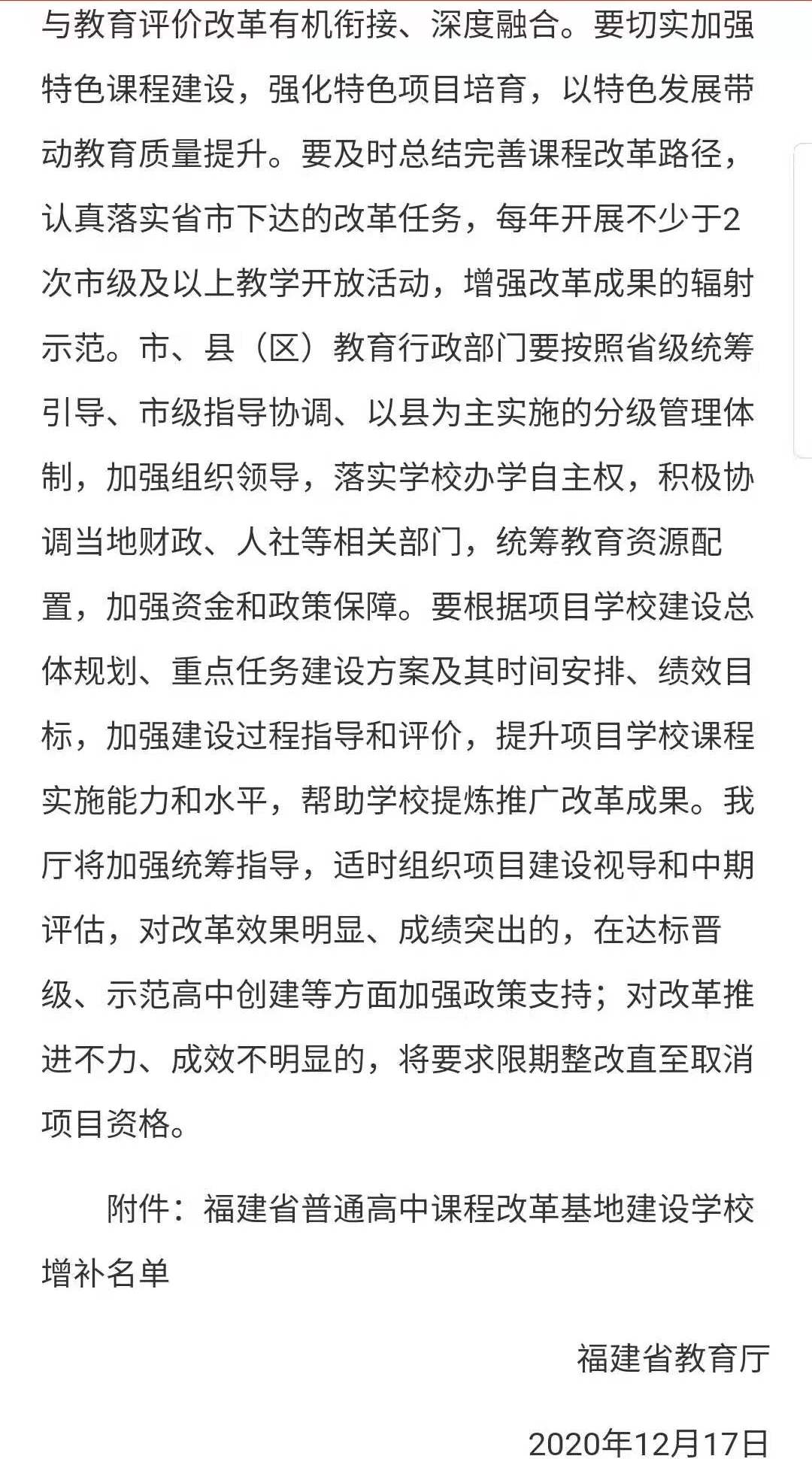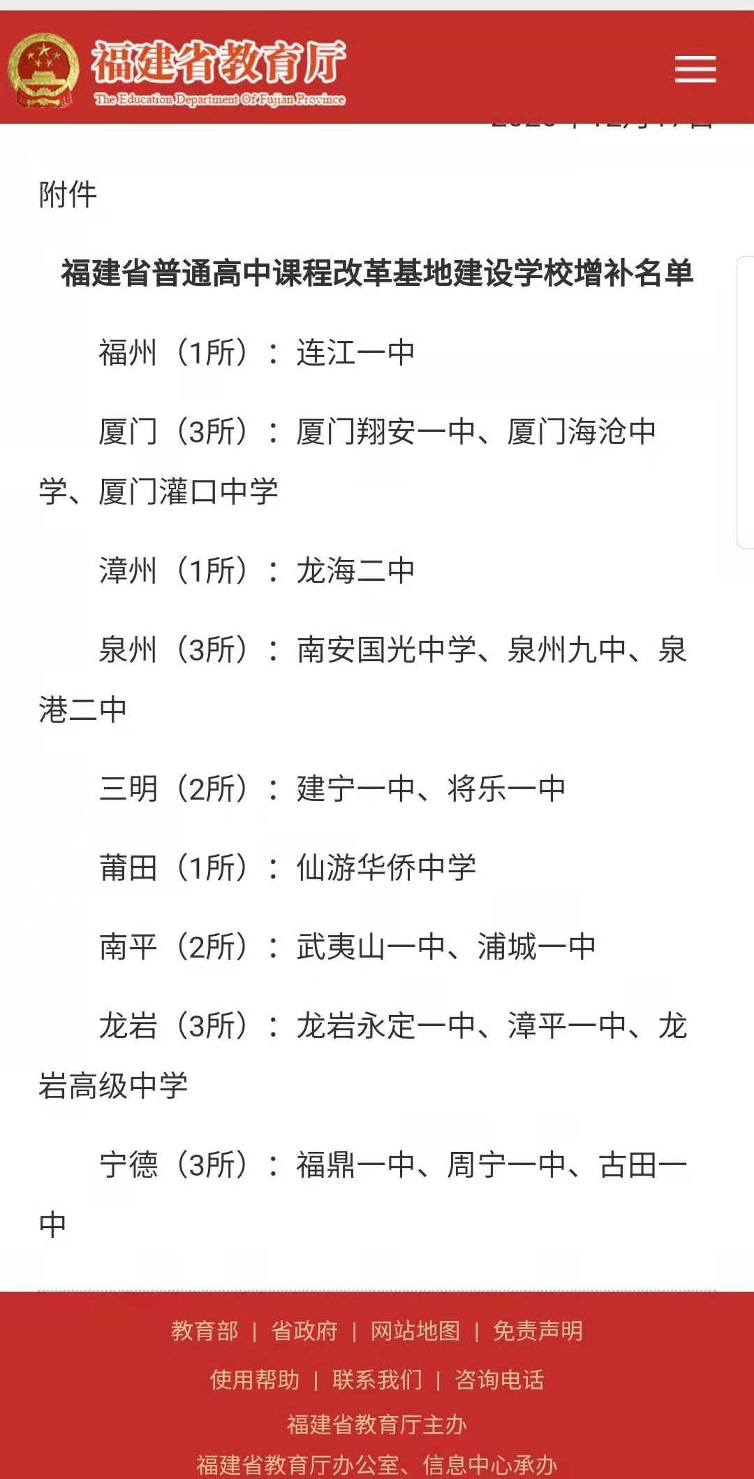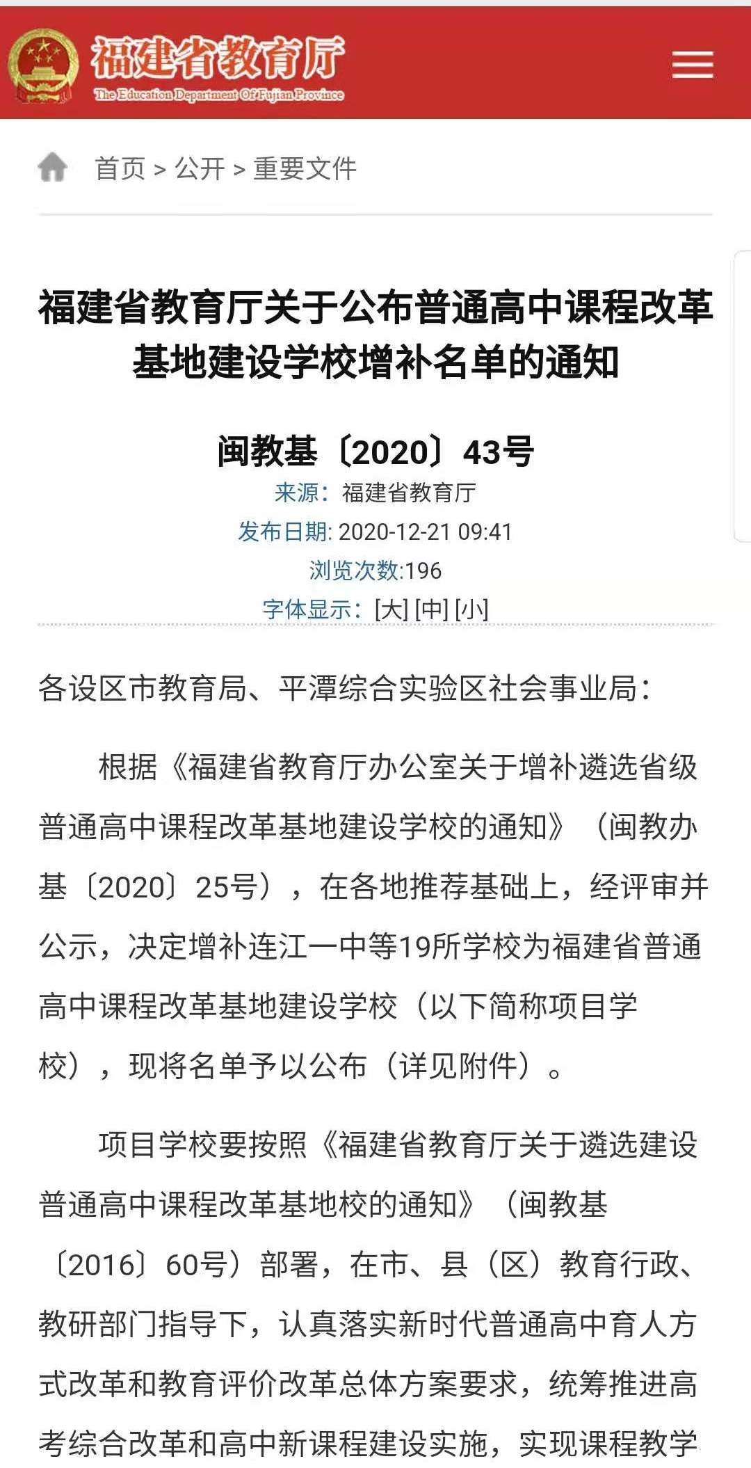 ![]() ![]() 福建省教育厅正式公布! 增补19所学校为福建省普通高中课程改革基地建设学校 莆田1所学校榜上有名 我校名列榜上!