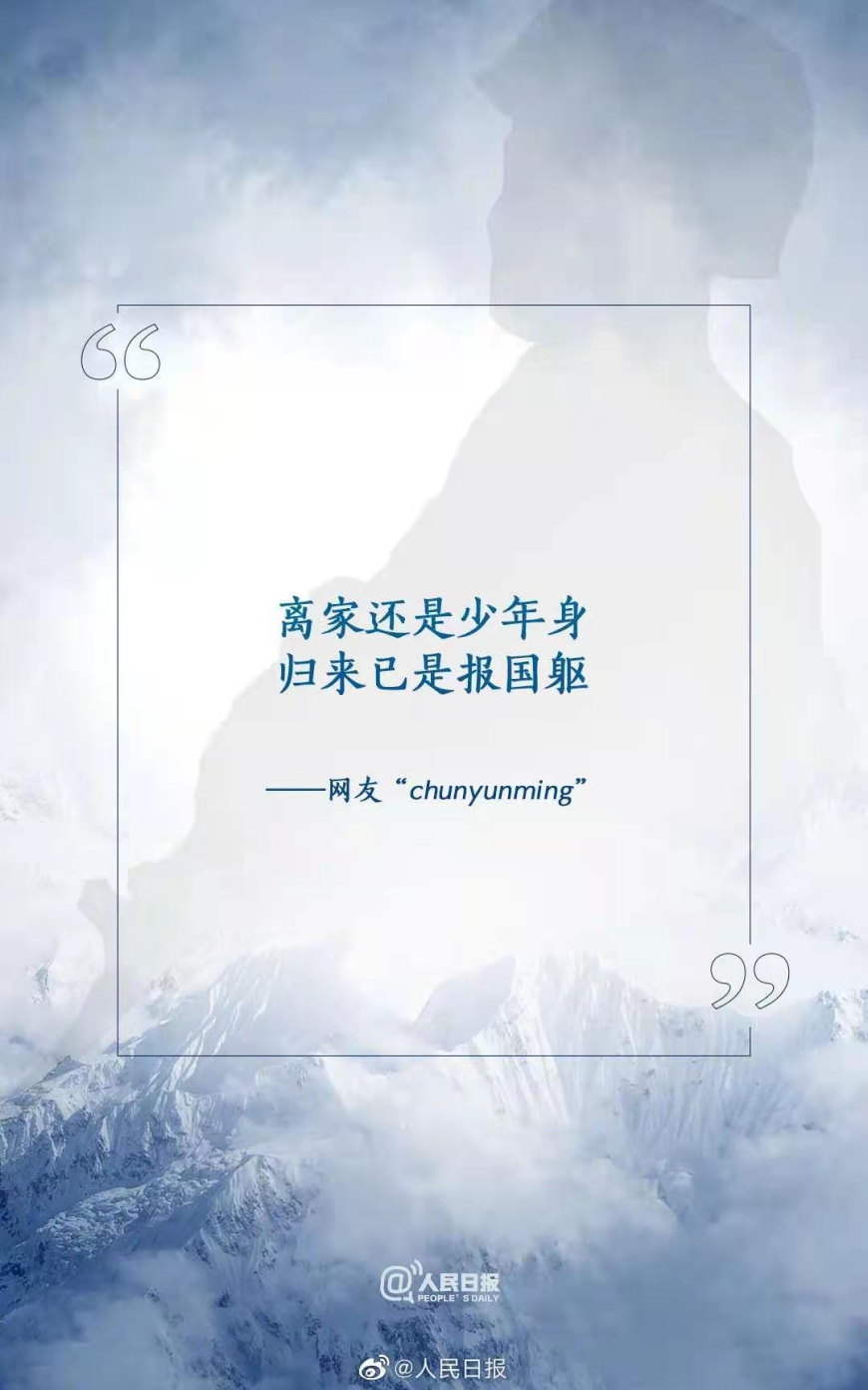 “答案很简单,可以从边防军人的声声誓言中找到。他们说,‘我们就是祖国的界碑,大好河山,寸土不让!’我觉得,这样坚定的信念和顽强的意志真的就像一个过滤器,让浮躁和畏惧远去,只留下最清澈、最纯粹的初心。”