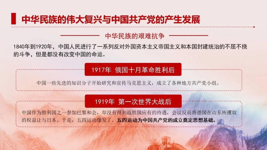 所以,封建主义走不下去,洋务运动、农民起义、资产阶级革命都行不通,最后中国又陷入了连绵不断的北洋军阀割据混战之中,民不聊生。1917年,俄国十月革命胜利后,中国一些先进的知识分子开始研究和宣传马克思主义,成立了各种地方共产党小组。1919年,第一次世界大战后,中国作为胜利国之一参加巴黎和会,却没有得到战胜国应有的待遇,会议反而将德国在山东所攫取的权益让与日本。于是,五四运动爆发了。五四运动为中国共产党的成立奠定思想基础。