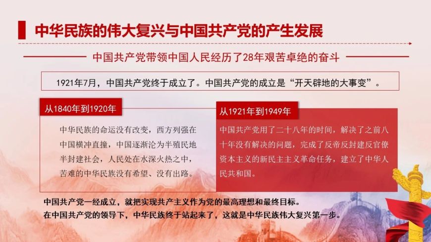 中国共产党的成立是“开天辟地的大事变”。从1840年到1920年的八十年间,中华民族的命运没有改变,西方列强在中国横冲直撞,中国逐渐沦为半殖民地半封建社会,人民处在水深火热之中,苦难的中华民族没有希望、没有出路。中国共产党一经成立,就把实现共产主义作为党的最高理想和最终目标。从1921年到1949年,中国共产党用了二十八年的时间,解决了之前八十年没有解决的问题,完成了反帝反封建反官僚资本主义的新民主主义革命任务,建立了中华人民共和国。在中国共产党的领导下,中华民族终于站起来了,这就是中华民族伟大复兴第一步。