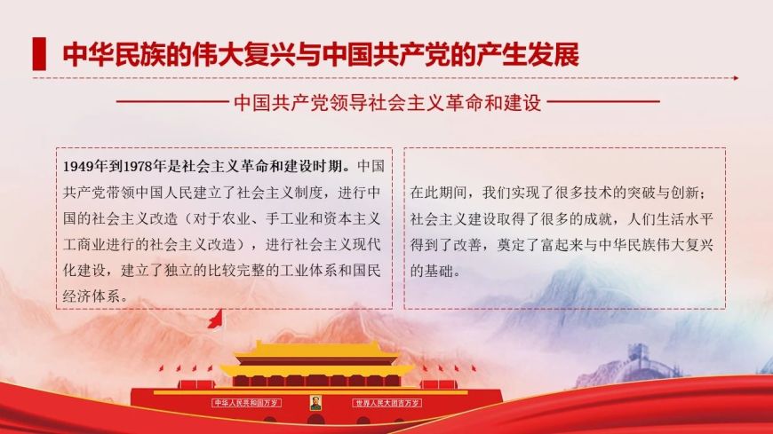 我国结束了在外国帝国主义统治下的殖民地和附属国的地位,成了一个真正独立的国家。那么接下来就是国家要富强,怎么样富起来?1949年到1978年是社会主义革命和建设时期。中国共产党带领中国人民建立了社会主义制度,进行中国的社会主义改造(对于农业、手工业和资本主义工商业进行的社会主义改造),进行社会主义现代化建设,建立了独立的比较完整的工业体系和国民经济体系。在此期间,我们实现了很多技术的突破与创新;社会主义建设取得了很多的成就,人们生活水平得到了改善,奠定了富起来与中华民族伟大复兴的基础。