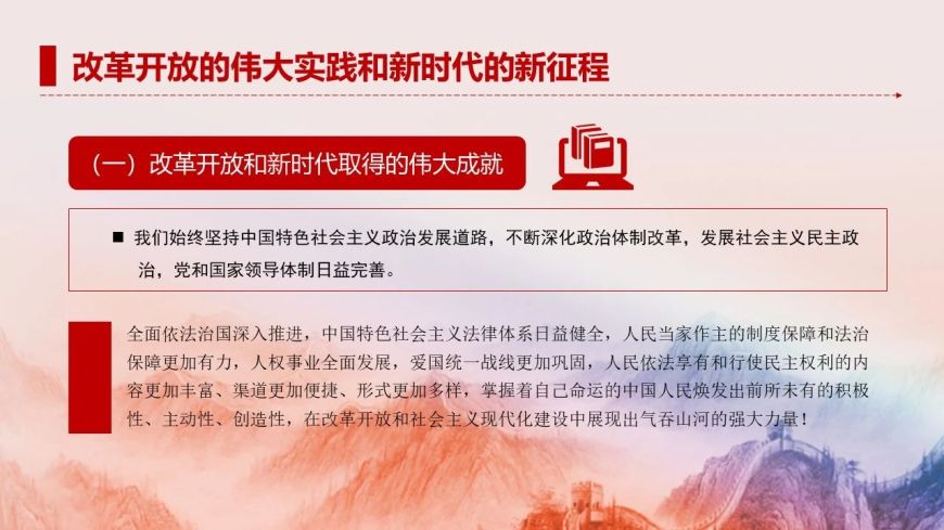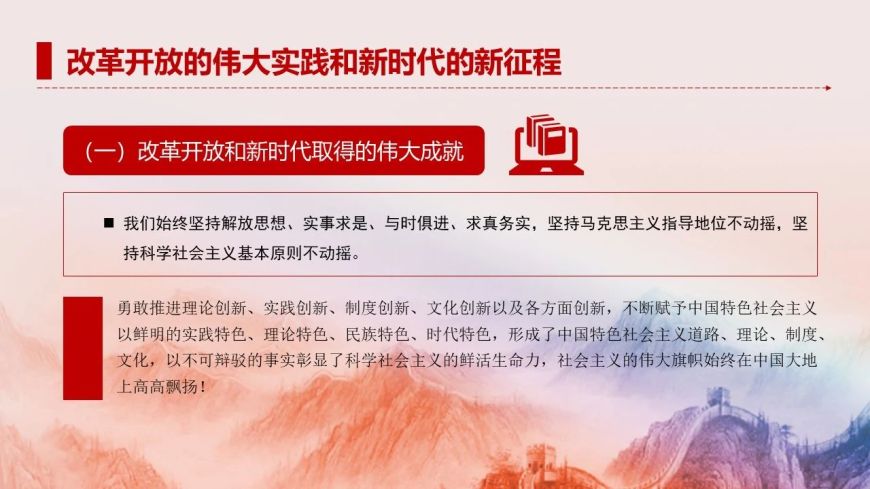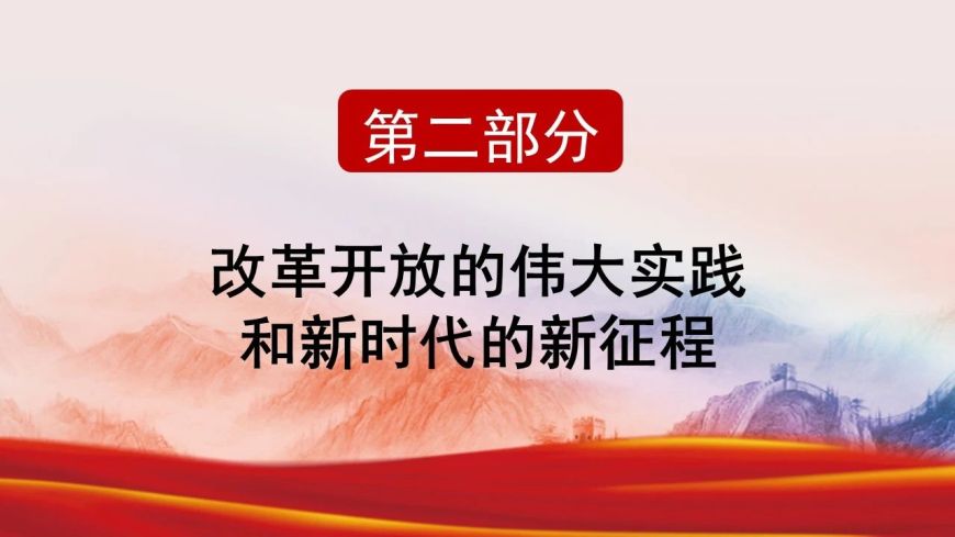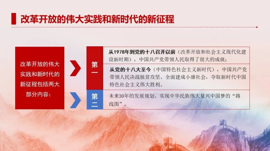 改革开放的伟大实践和新时代的新征程包括两大部分内容:第一,从1978年到党的十八召开以前(改革开放和社会主义现代化建设新时期),中国共产党带领人民取得了很大的成就;从党的十八大至今(中国特色社会主义新时代),中国共产党带领人民决战脱贫攻坚、全面建成小康社会,夺取新时代中国特色社会主义伟大胜利。第二,未来30年的发展规划、实现中华民族伟大复兴中国梦的“路线图”。