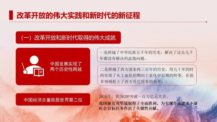 中国经济总量跃居世界第二位。2020年,我国GDP突破一百万亿元大关,这是了不起的成就。我国脱贫攻坚战取得了全面胜利,为实现全面建成小康社会目标任务作出了关键性贡献。