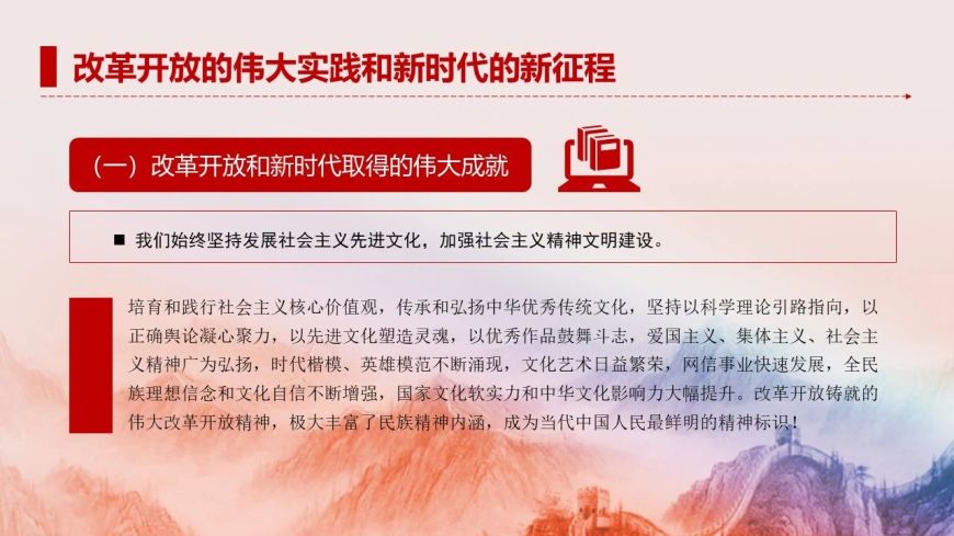 第四,我们始终坚持发展社会主义先进文化,加强社会主义精神文明建设,培育和践行社会主义核心价值观,传承和弘扬中华优秀传统文化,坚持以科学理论引路指向,以正确舆论凝心聚力,以先进文化塑造灵魂,以优秀作品鼓舞斗志,爱国主义、集体主义、社会主义精神广为弘扬,时代楷模、英雄模范不断涌现,文化艺术日益繁荣,网信事业快速发展,全民族理想信念和文化自信不断增强,国家文化软实力和中华文化影响力大幅提升。改革开放铸就的伟大改革开放精神,极大丰富了民族精神内涵,成为当代中国人民最鲜明的精神标识!
