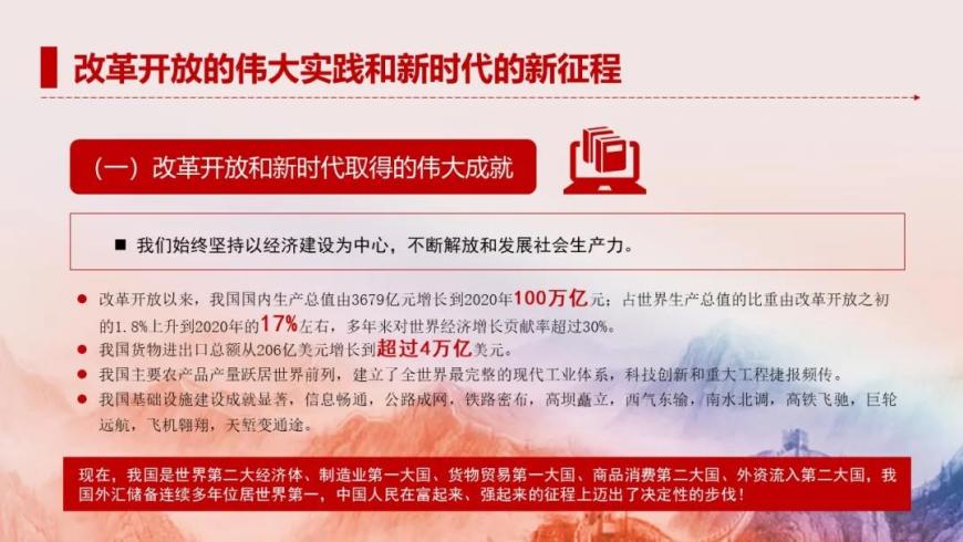 第二,我们始终坚持以经济建设为中心,不断解放和发展社会生产力。改革开放以来,我国国内生产总值由3679亿元增长到2020年100万亿元,年均实际增长9.5%,远高于同期世界经济2.9%左右的年均增速。我国国内生产总值占世界生产总值的比重由改革开放之初的1.8%上升到2020年的17%左右,多年来对世界经济增长贡献率超过30%。我国货物进出口总额从206亿美元增长到超过4万亿美元。我国主要农产品产量跃居世界前列,建立了全世界最完整的现代工业体系,科技创新和重大工程捷报频传。我国基础设施建设成就显著,信息畅通,公路成网,铁路密布,高坝矗立,西气东输,南水北调,高铁飞驰,巨轮远航,飞机翱翔,天堑变通途。现在,我国是世界第二大经济体、制造业第一大国、货物贸易第一大国、商品消费第二大国、外资流入第二大国,我国外汇储备连续多年位居世界第一,中国人民在富起来、强起来的征程上迈出了决定性的步伐!这是在中国共产党的领导下,全国人民共同努力在经济领域取得的成就。