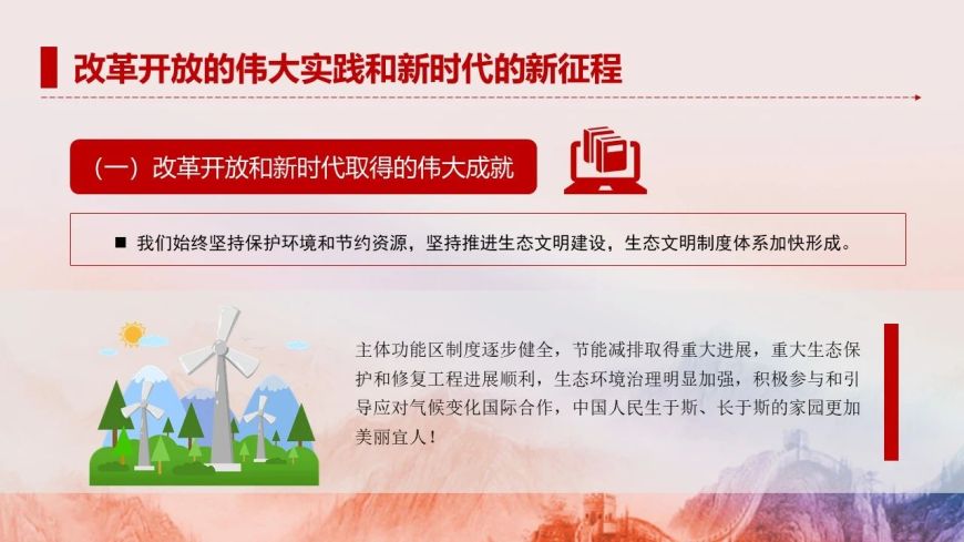 第六,我们始终坚持保护环境和节约资源,坚持推进生态文明建设,生态文明制度体系加快形成,主体功能区制度逐步健全,节能减排取得重大进展,重大生态保护和修复工程进展顺利,生态环境治理明显加强,积极参与和引导应对气候变化国际合作,中国人民生于斯、长于斯的家园更加美丽宜人!