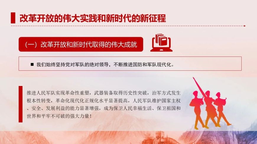 第七,我们始终坚持党对军队的绝对领导,不断推进国防和军队现代化,推进人民军队实现革命性重塑,武器装备取得历史性突破,治军方式发生根本性转变,革命化现代化正规化水平显著提高,人民军队维护国家主权、安全、发展利益的能力显著增强,成为保卫人民幸福生活、保卫祖国和世界和平牢不可破的强大力量!