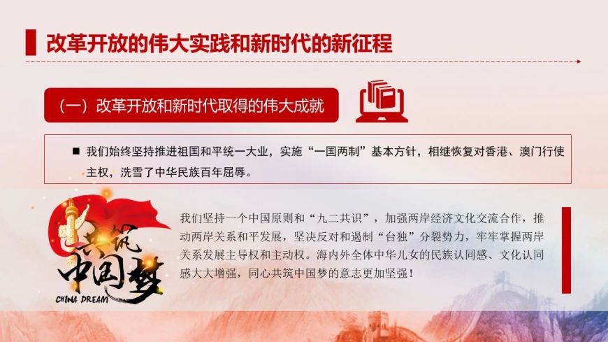 第八,我们始终坚持推进祖国和平统一大业,实施“一国两制”基本方针,相继恢复对香港、澳门行使主权,洗雪了中华民族百年屈辱。我们必须坚持一个中国原则,坚持“九二共识”,加强两岸经济文化交流合作,推动两岸关系和平发展,坚决反对和遏制“台独”分裂势力,牢牢掌握两岸关系发展主导权和主动权。海内外全体中华儿女的民族认同感、文化认同感大大增强,同心共筑中国梦的意志更加坚强!