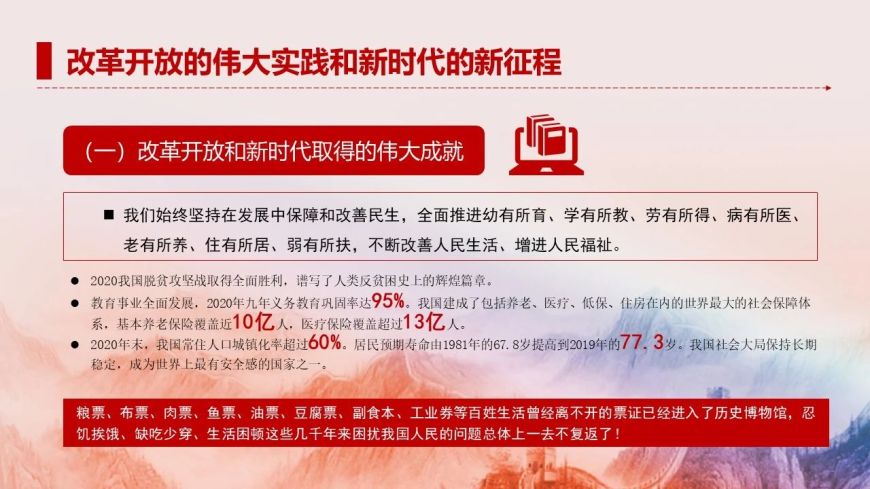 第五,我们始终坚持在发展中保障和改善民生,全面推进幼有所育、学有所教、劳有所得、病有所医、老有所养、住有所居、弱有所扶,不断改善人民生活、增进人民福祉。2020年我国脱贫攻坚战取得全面胜利,谱写了人类反贫困史上的辉煌篇章。教育事业全面发展,2020年九年义务教育巩固率达95%。我国建成了包括养老、医疗、低保、住房在内的世界最大的社会保障体系,基本养老保险覆盖近10亿人,医疗保险覆盖超过13亿人。2020年末,我国常住人口城镇化率超过60%。居民预期寿命由1981年的67.8岁提高到2019年的77.3岁。我国社会大局保持长期稳定,成为世界上最有安全感的国家之一。粮票、布票、肉票、鱼票、油票、豆腐票、副食本、工业券等百姓生活曾经离不开的票证已经进入了历史博物馆,忍饥挨饿、缺吃少穿、生活困顿这些几千年来困扰我国人民的问题总体上一去不复返了!