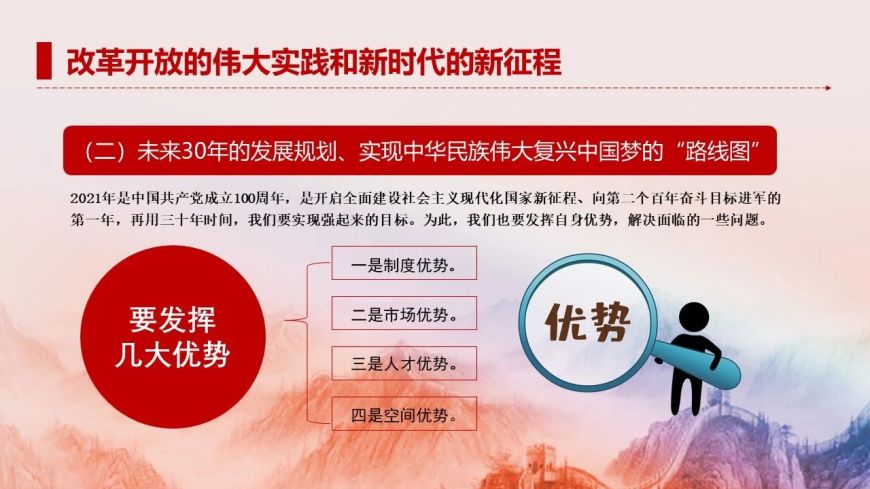 2021年是中国共产党成立100周年,是开启全面建设社会主义现代化国家新征程、向第二个百年奋斗目标进军的第一年,再用三十年时间,我们要实现强起来的目标。为此,我们也要发挥自身优势,解决面临的一些问题。