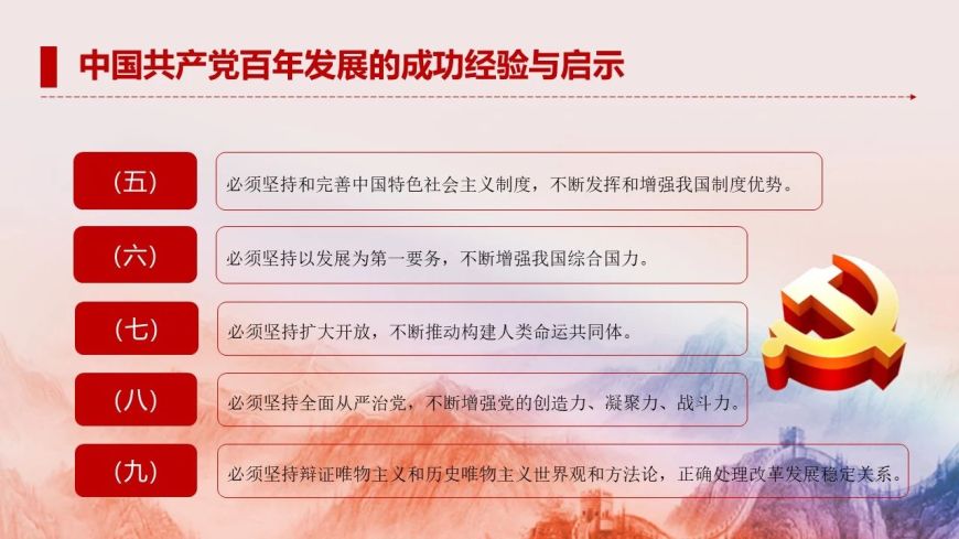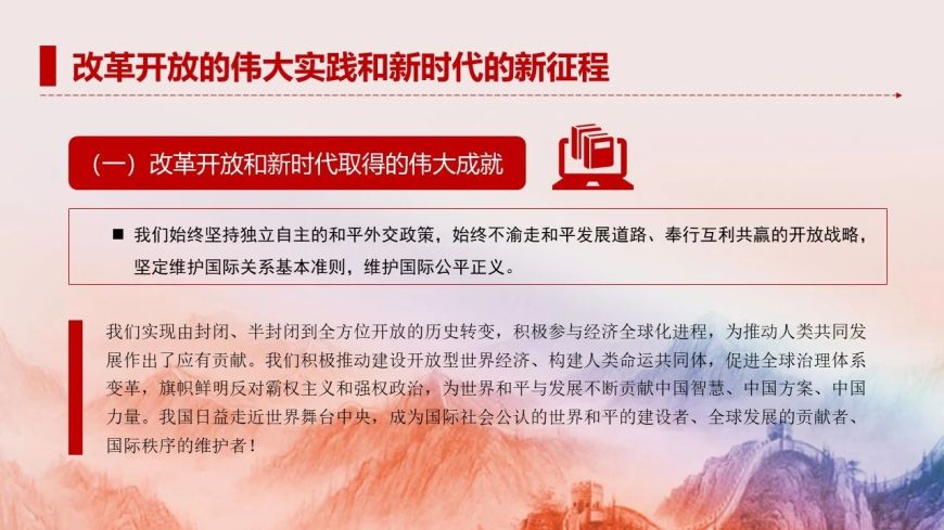 第九,我们始终坚持独立自主的和平外交政策,始终不渝走和平发展道路、奉行互利共赢的开放战略,坚定维护国际关系基本准则,维护国际公平正义。我们实现由封闭、半封闭到全方位开放的历史转变,积极参与经济全球化进程,为推动人类共同发展作出了应有贡献。我们积极推动建设开放型世界经济、构建人类命运共同体,促进全球治理体系变革,旗帜鲜明反对霸权主义和强权政治,为世界和平与发展不断贡献中国智慧、中国方案、中国力量。我国日益走近世界舞台中央,成为国际社会公认的世界和平的建设者、全球发展的贡献者、国际秩序的维护者!