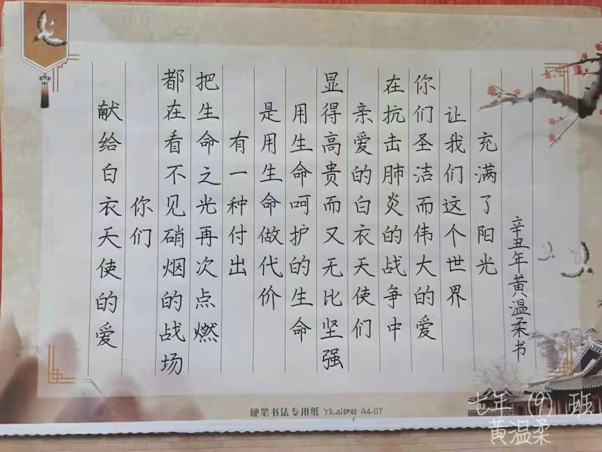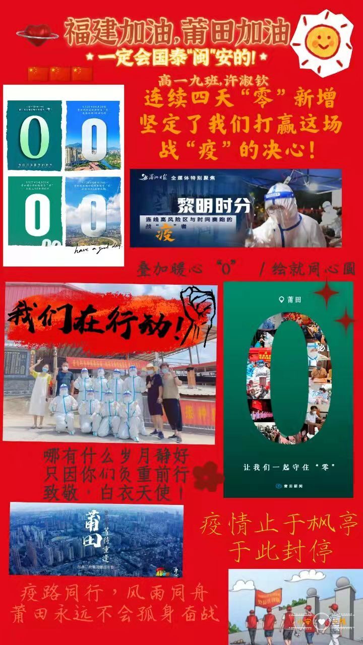 在这个特殊的日子里,莆阳人民同心战疫,守护家园,“疫”起面对突如其来的疫情。在这场不见硝烟的战场,有无数人的背影让我们难以记住却又让我们永远铭记。那许许多多的背影,看似弱小,实则高大;看似单薄,实则伟岸。仙游侨中的学子用自己的方式表达了对祖国的热爱,对白衣执甲的医护人员的敬佩之情。