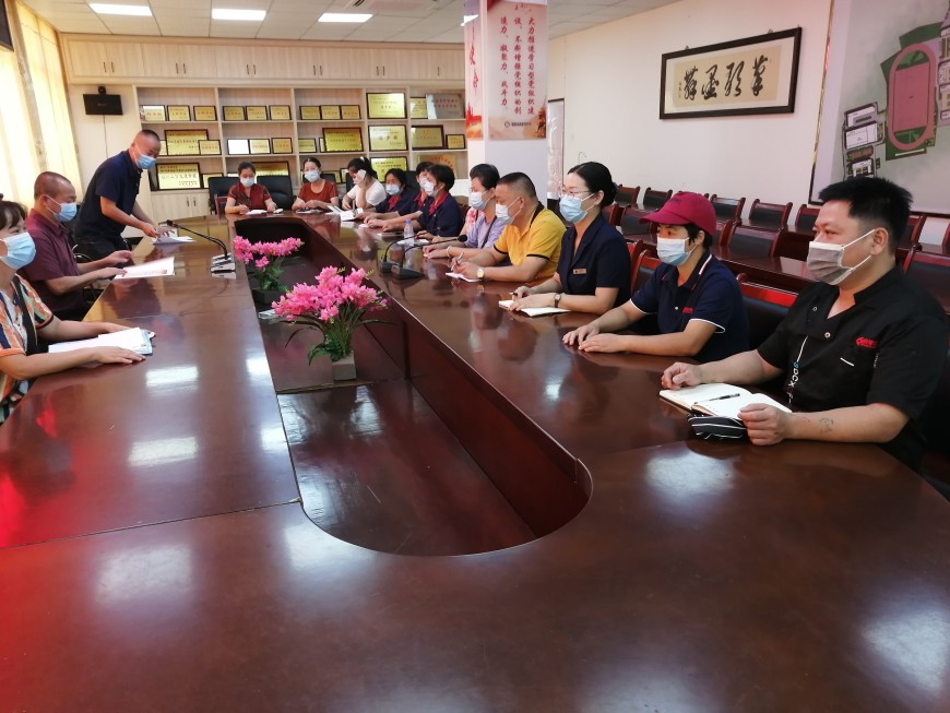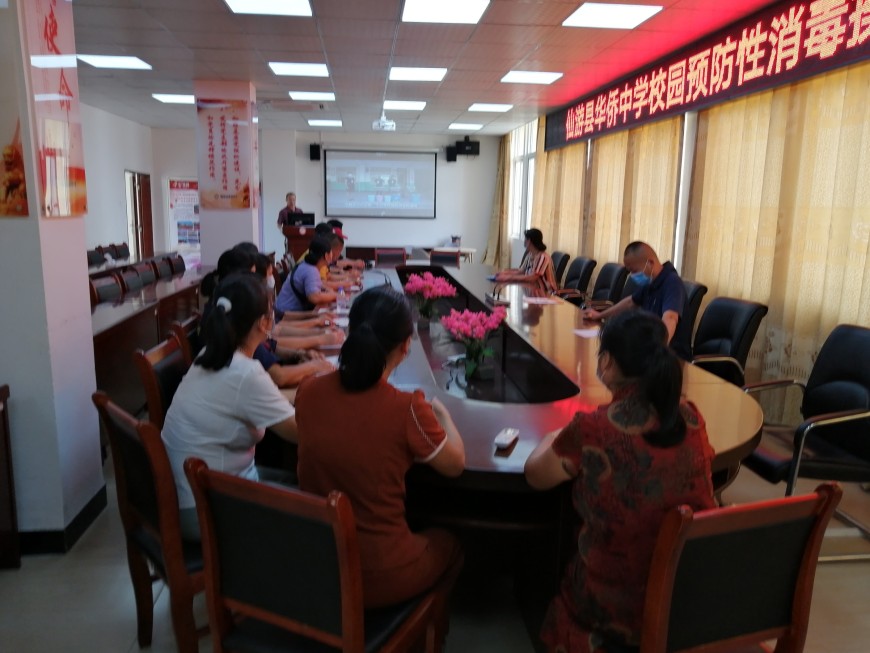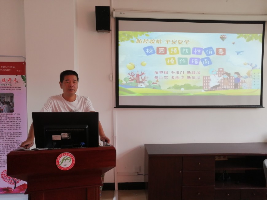 在办公楼三层会议室首先由郑云清副校长对工作进行布置,对校内环境预防性消毒工作进行动员部署,要求确保各项工作落细落地落到实处,切实阻断病毒传播途径,防止疫情死灰复燃。接着对十来位的消杀人员进行开展消杀培训,他们认真地观看学校自制的防疫视频,学习如何进行专业化消杀,确保消杀工作科学有效。