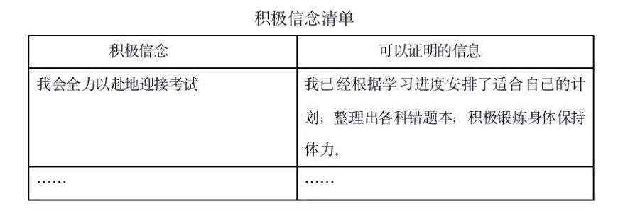 面对中、高考,我们可能内心会弹出很多对自己的对考试的看法,有些可能是消极的,它会让我们产生不自信、没价值或自己不完美的这些想法;而积极信念会带给我们乐观向上、价值感、勇气和行动力。那如何建立积极信念呢?