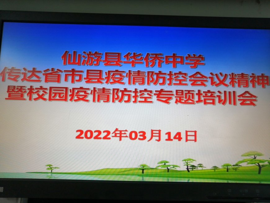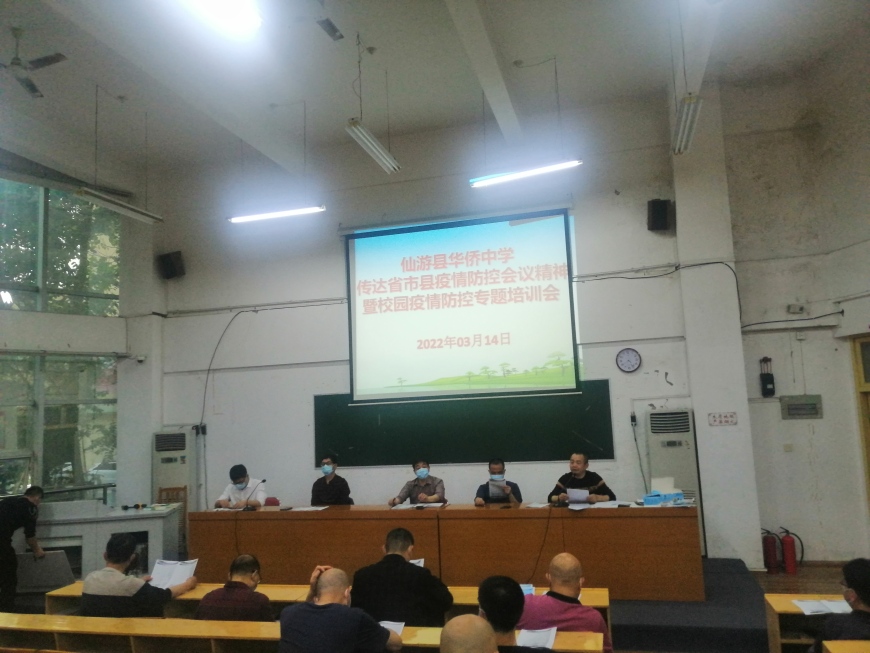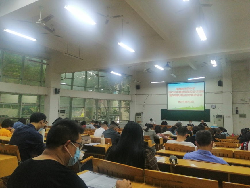 3月14日下午,仙游侨中召开传达省市县疫情防控会议精神暨校园疫情防控专班培训会,全体专班人员,其中包含校务成员、全体班主任、物业经理、食堂经理、校医、心理老师等参加会议。