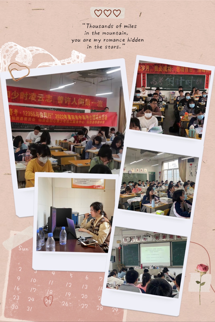 岁月如歌,光阴似箭,花开花谢,又见高考。高考时节,考生们的学习和生活随着考试日期的临近变得愈加紧张。面对父母和老师的期待、学习强度难度的加大等一连串的压力源,考生容易出现考前学习动力不足、学习焦虑、情绪烦躁等心理问题,导致考试心态出现不同程度的波动。2022年3月15日,仙游县华侨中学携手团县委通过考前心理热线、心理解压讲座等一系列“减压”活动形式,让考生释放紧张心情、宣泄焦虑、烦躁等不良情绪,克服因为时间紧迫、学业紧张导致的不良反应,化解考前焦虑,以健康的心理、正常的心态、饱满的情绪迎考备考。