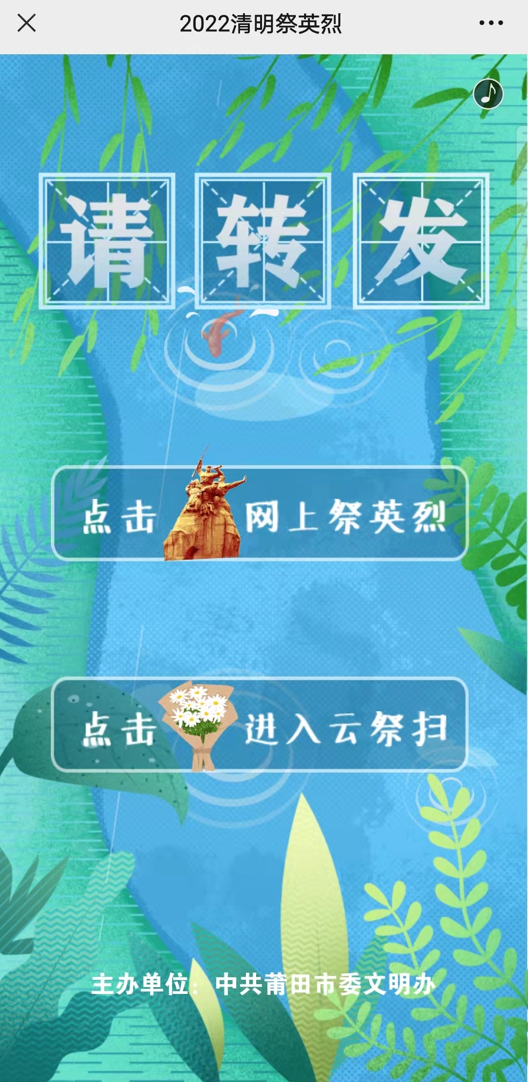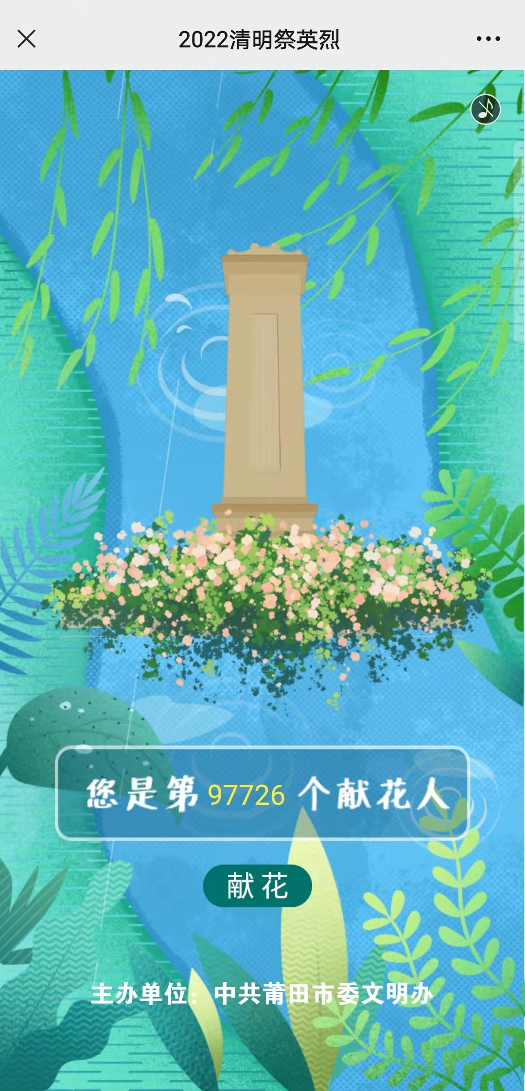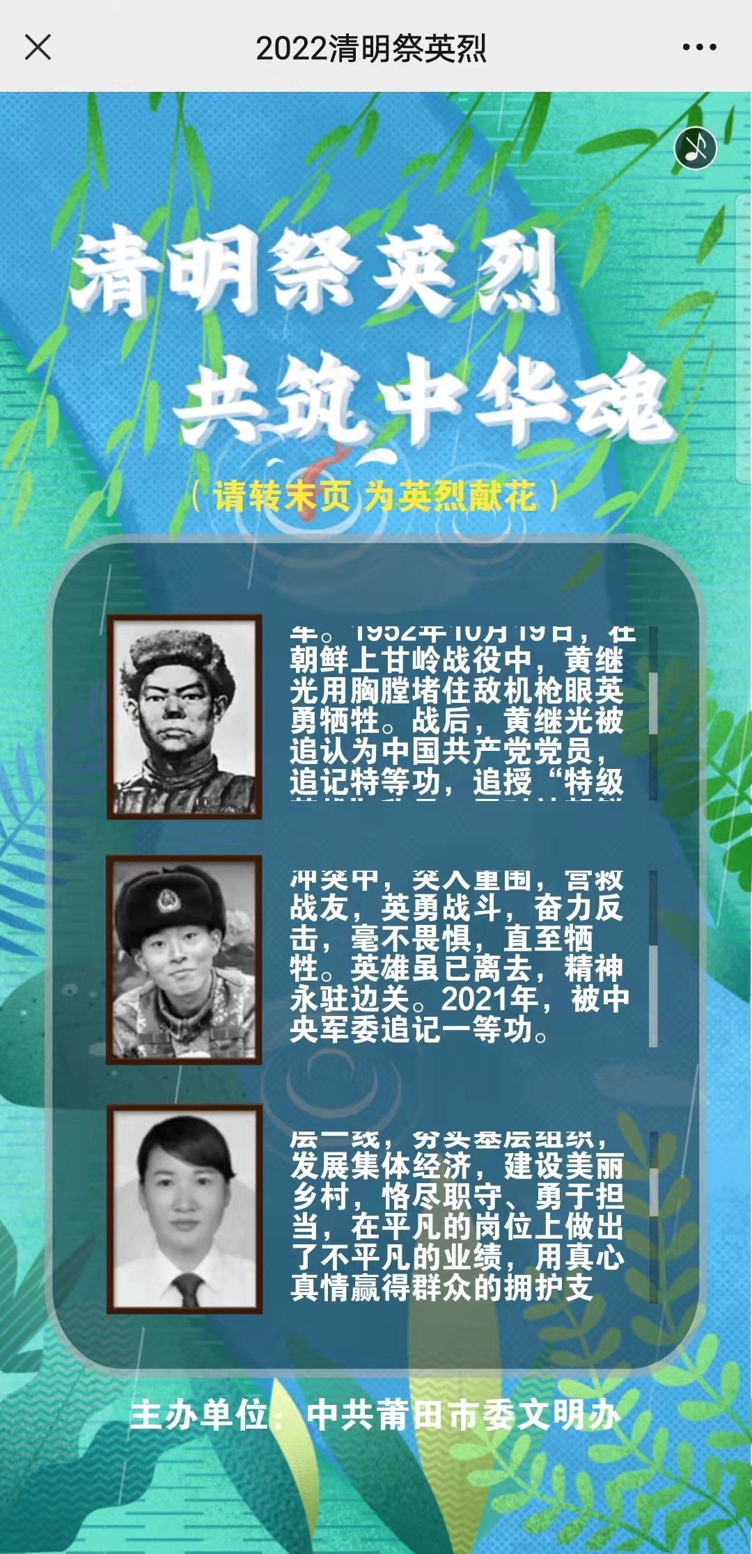 进入“网上祭英烈”活动或关注莆田文明号,积极参与网上祭扫、线上献花、留言互动等活动,表达我们对英烈们的崇高敬意!