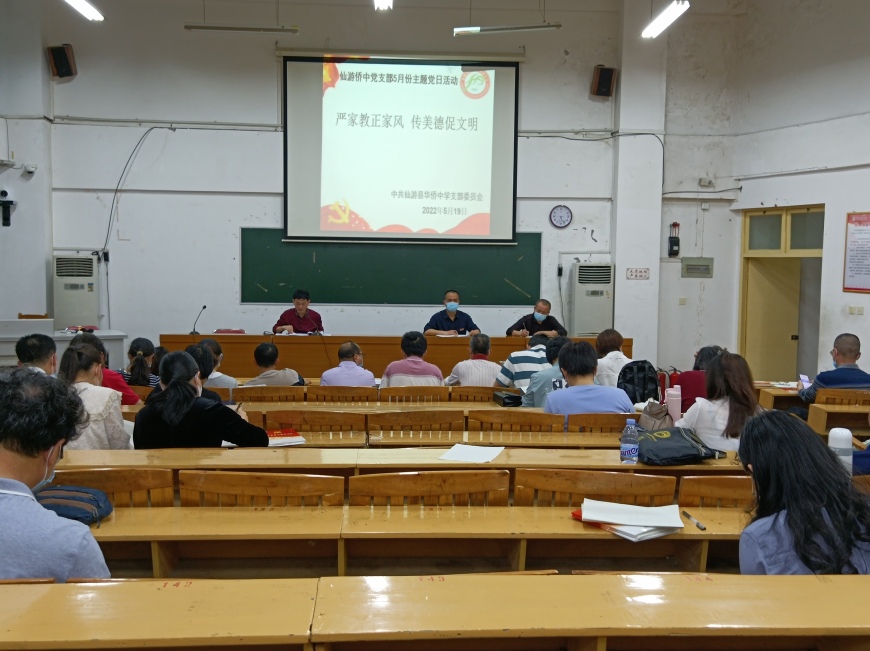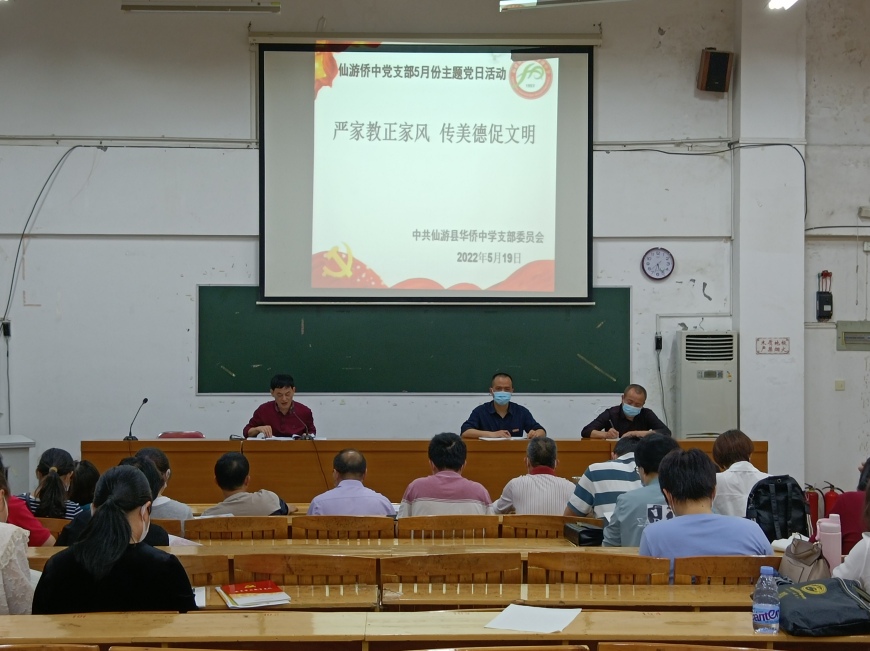 为深入学习贯彻习近平总书记关于注重家庭家教家风建设的重要论述,培育和践行社会主义核心价值观,建设文明家庭、实施科学家教、传承优良家风,强化党员教师家风建设,5月19日下午,中共仙游县华侨中学支部委员会举行“严家教正家风 传美德促文明”主题党日活动,会议由学校党支部委员、副校长王赛静同志主持。