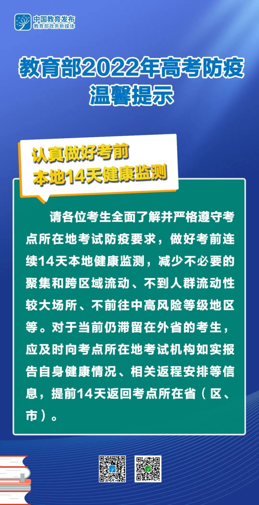 为切实保障广大考生和考试工作人员的生命安全和身体健康,确保2022年全国高考平稳、有序举行,按照教育部、国家卫生健康委关于高考防疫工作的有关要求,近期,各地已陆续向2022年高考考生发布参加高考的注意事项。在此,教育部再次提醒全体考生——
