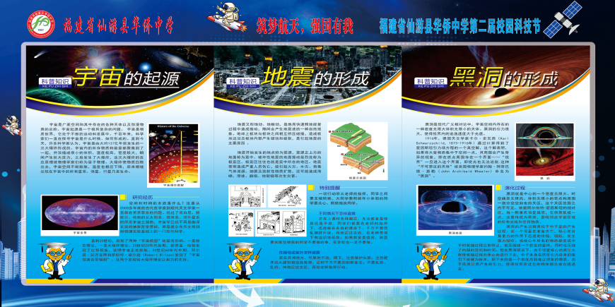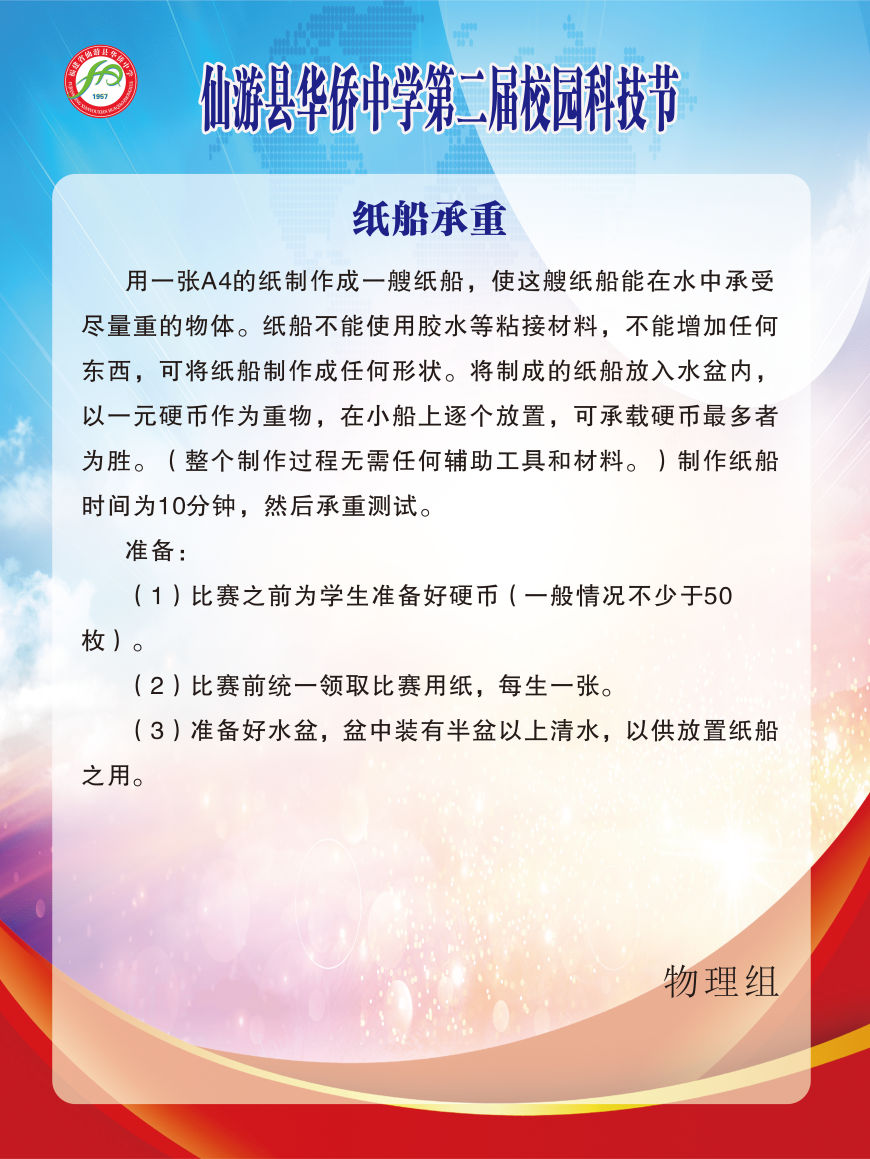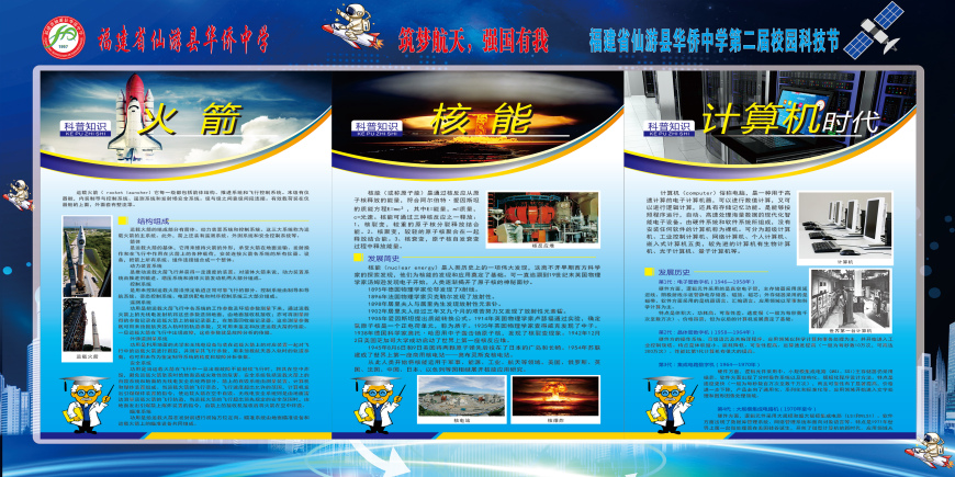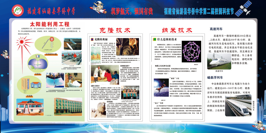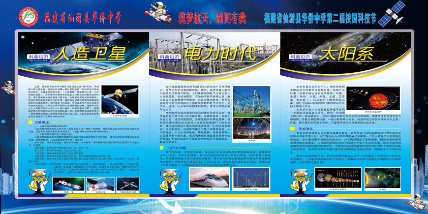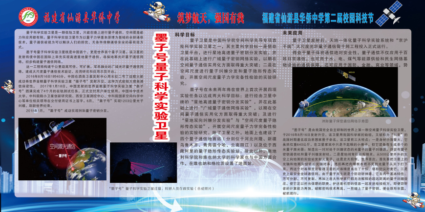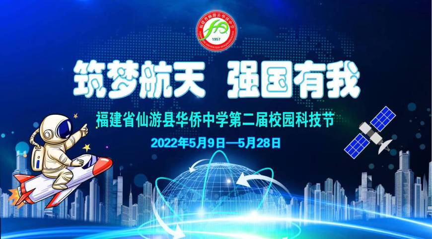 为深入推进“双减”政策,弘扬红色文化和弘扬航天精神,点亮学生崇尚科学、探索未知、敢于创新的航天梦想,树立科技强国的信念,激发学生爱国情怀和自强精神,提升学生综合素养,促进学生全面发展,同时践行仙游侨中“以德立校 以爱育人”的办学理念,2022年5月23日-28日,我校特举办了2022以“筑梦航天 强国有我”为主题的第二届“科技节”系列活动。