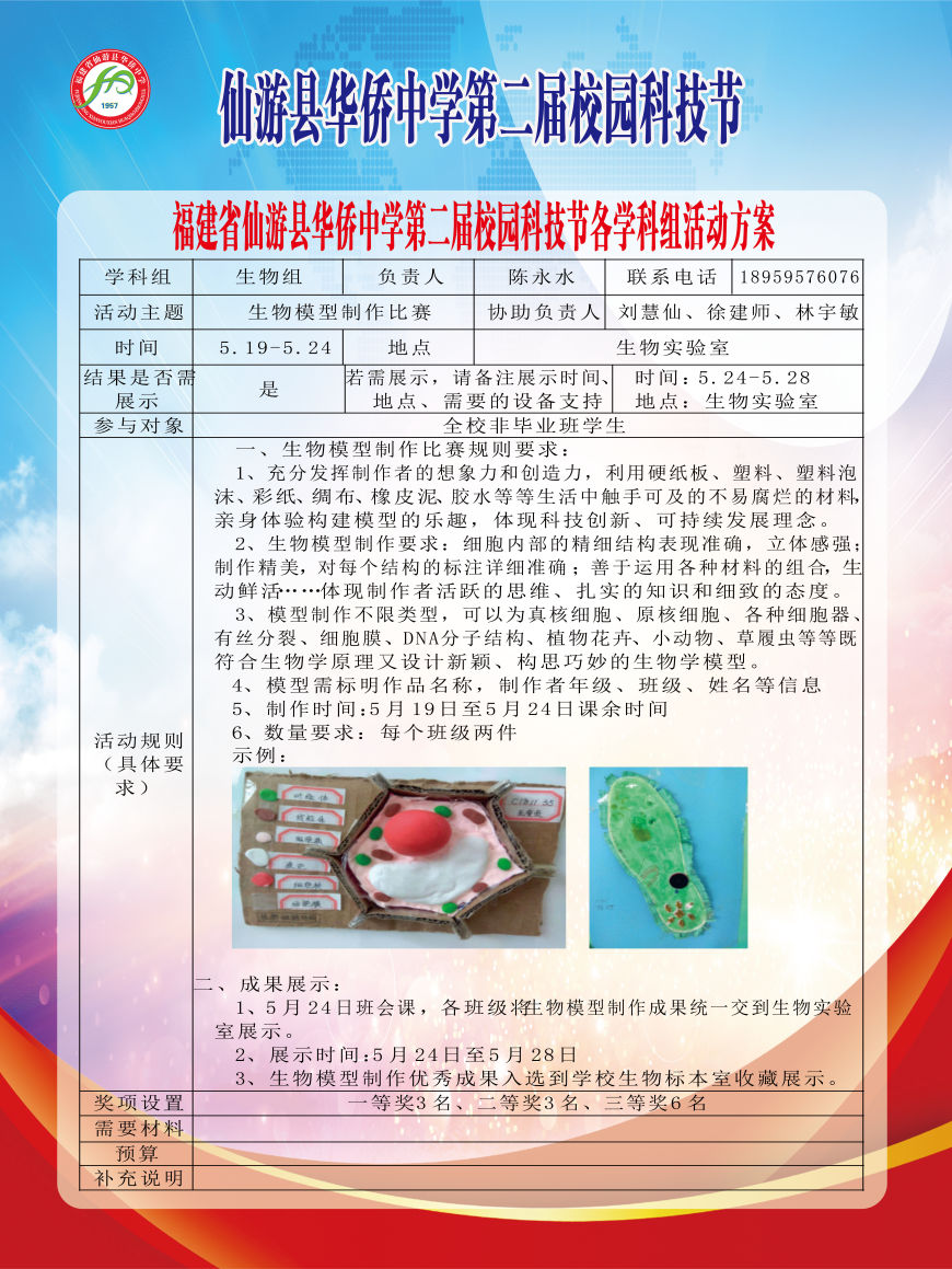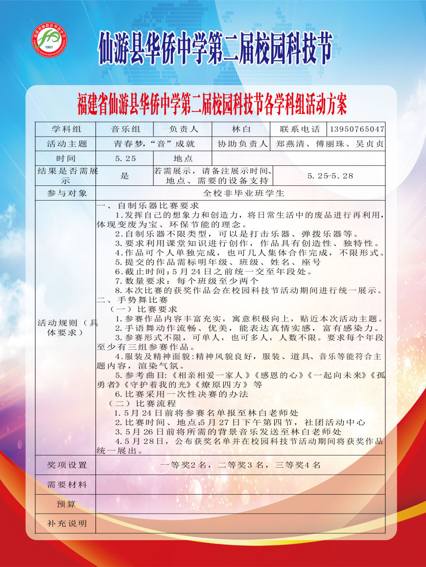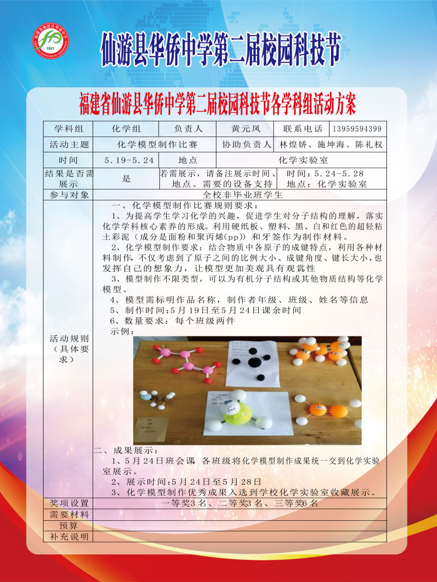 为深入推进“双减”政策,弘扬红色文化和弘扬航天精神,点亮学生崇尚科学、探索未知、敢于创新的航天梦想,树立科技强国的信念,激发学生爱国情怀和自强精神,提升学生综合素养,促进学生全面发展,同时践行仙游侨中“以德立校 以爱育人”的办学理念,2022年5月23日-28日,我校特举办了2022以“筑梦航天 强国有我”为主题的第二届“科技节”系列活动。