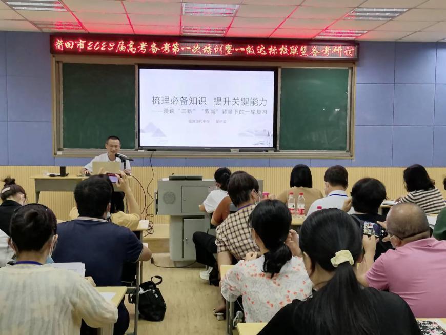 仙游县华侨中学各科优秀老师发挥承办学校的主人翁精神,纷纷开展了优质公开课和专题讲座,通过高考典型案例分析,探究新高考方向,为2023届高考复习提供了借鉴和努力方向。例如政治组的林永忠老师执教的公开课《更好发挥政府作用》,通过温故知新导入新课复习、情境探究引导解析材料、知识梳理构建逻辑框架、练习解答直面高考真题、易混易错辨析规避概念认识误区等环节,引导学生初步掌握、理解知识点内容,并贯穿学科核心素养和应试能力水平的培养;物理组的林丽红老师结合本校高三物理一轮复习的实际情况,开展了关于《三新背景下高三物理第一轮复习策略》的讲座,提出重视基础知识,课堂教学低进高出;实施多元检测,课堂教学评价有法;设计层次作业,课堂教学及时巩固;课后及时反馈,课堂教学二次升华等具有针对性的复习备考策略。