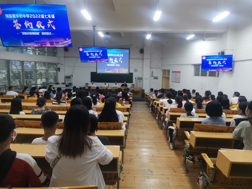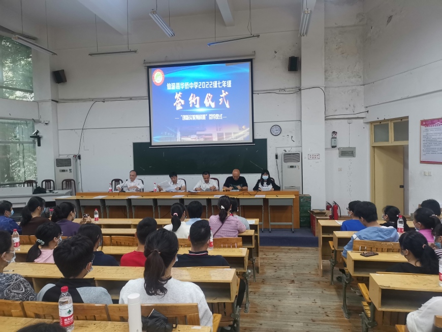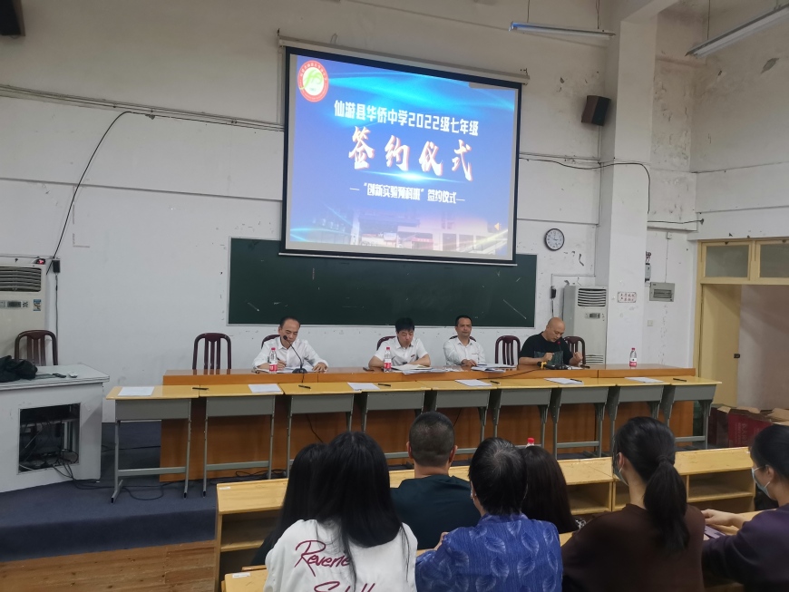 2022年11月20日下午3点,根据莆田市高中招生工作的相关精神,经过学校的精心筹划和七年级的扎实筹备,仙游县华侨中学2022级初中“创新实验预科班”签约仪式在校教工会议室隆重举行。校党支部书记、校长凌建华、副校长陈金朋、学校有关部门负责人、七年级管理成员以及全体签约学生及其监护人共一百六十多人出席会议。